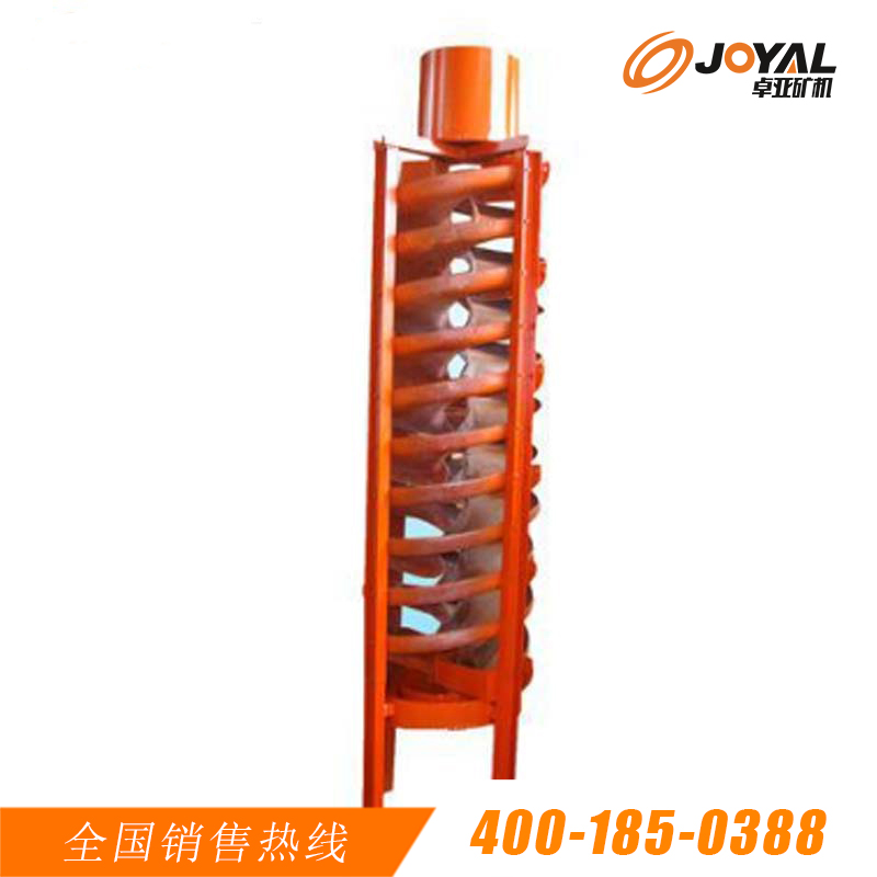 螺旋溜槽的螺旋槽的设计材料为玻璃钢,并且螺旋槽的内表面还涂有耐磨材料,保证了螺旋溜槽的耐磨性以及较长的使用周期。并且还可以根据用户的具体需要,做成不同的层数。一般常用的有单头,双头,三头以及四头等几种不同的结构。